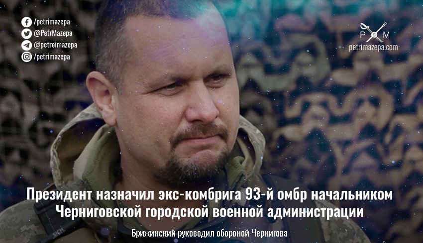 Сегодня 17 февраля 2023 года Президент Украины Владимир Зеленский подписал распоряжение №19/2023-рп о назначении Дмитрия Брижинского начальником Черниговской городской военной администрации Черниговского района Черниговской области. Непосредственно руководил обороной Чернигова и является его почетным гражданином.