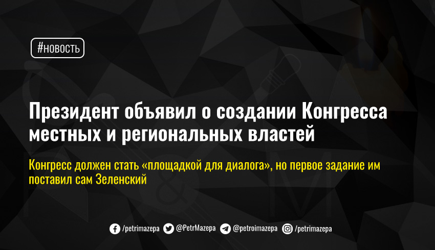 На заседании Совета развития громад и территорий в рамках Всеукраинского форума «Украина 30» президент Украины Владимир Зеленский объявил о создании Конгресса местных и региональных властей. Этот орган должен способствовать «установлению качественно новых отношений между центральной и местной властью».