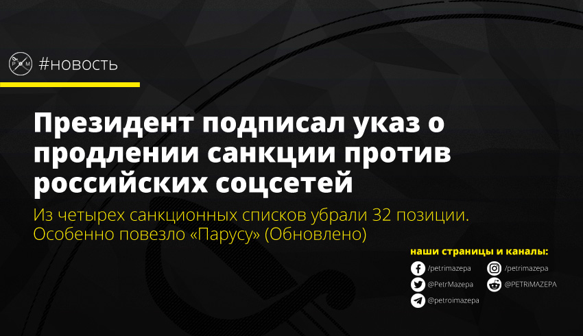 Президент Владимир Зеленский продлил санкции против российских социальных сетей и интернет-ресурсов, таких как «Вконтакте» и «Одноклассники», «Яндекс», Mail.ru, «Доктор Веб», «Касперский» и 1С.