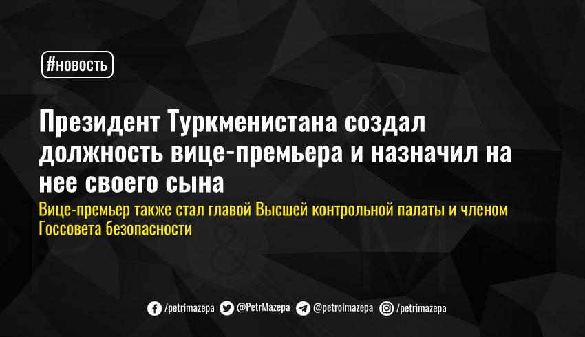 Президент Туркменистана Гурбангулы Бердымухамедов создал новую должность вице-премьера, который также является главой Высшей контрольной палаты и членом Государственного совета безопасности. Указ об учреждении новой должности появился только вчера, а уже сегодня на нее был назначен сын президента Сердар Бердымухамедов.