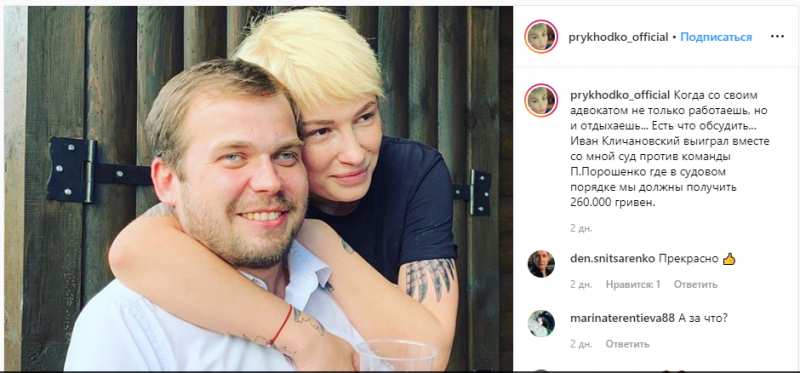 И хотя в своем инстаграме она написала «Иван Кличановский выиграл вместе со мной суд против команды П.Порошенко, где в судовом порядке мы должны получить 260.000 гривен», позднее в ролике, распространенном в Facebook, Приходько жалуется, что Порошенко не хочет платить ей 1 гривну морального вреда.