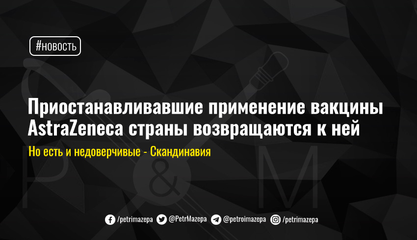 Однако такие страны, как Дания, Норвегия и Швеция, которые ранее ввели временный запрет на препарат, их примеру не следуют. Службы здравоохранения Норвегии заявили, что «хотят тщательно изучить ситуацию». В Швеции регулятор намерен провести собственное расследование выявленных случаев образования тромбов у людей, сделавших прививку AstraZeneca, и объявить о своем решении в отношении вакцины на следующей неделе. В Дании также решили пока понаблюдать за теми случаями побочных эффектов, которые уже зарегистрированы.