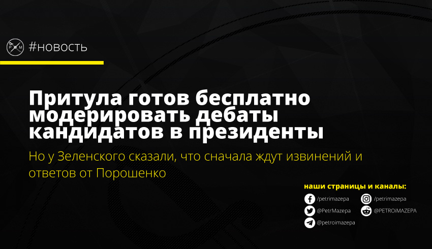 Получить дополнительные пять минут славы на теме дебатов может не только лишь каждый, но украинский актер шоумен Сергей Притула – смог. Он предложил свои услуги ведущего. Хотя, по данным «Українських Новин», в команде Зеленского продолжают «ждать извинений от Порошенко», а не просто согласия на дебаты.