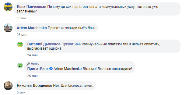 Под этим постом пользователи оставили комментарии, что коммунальные платежи не проходят. На что в банке ответили — «уже все наладили». А также — лежит версия для бизнеса.