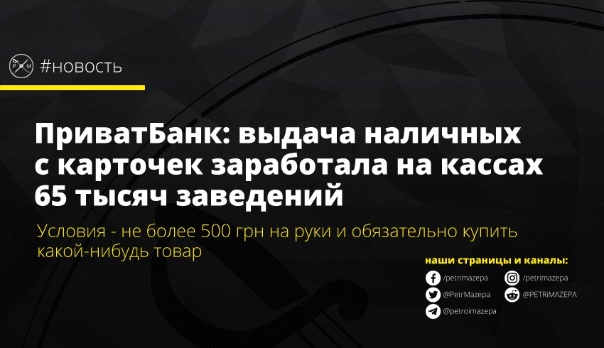 ПриватБанк: выдача наличных с карточек заработала на кассах 65 тысяч заведений