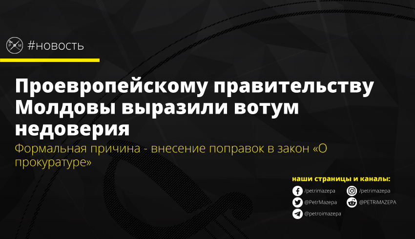 Парламент Молдовы поддержал инициативу относительно вотума недоверия проевропейскому правительству Майи Санду. Причина - внесение поправок в закон «О прокуратуре», которые предусматривают выдвижение премьер-министром кандидатов на должность генпрокурора.