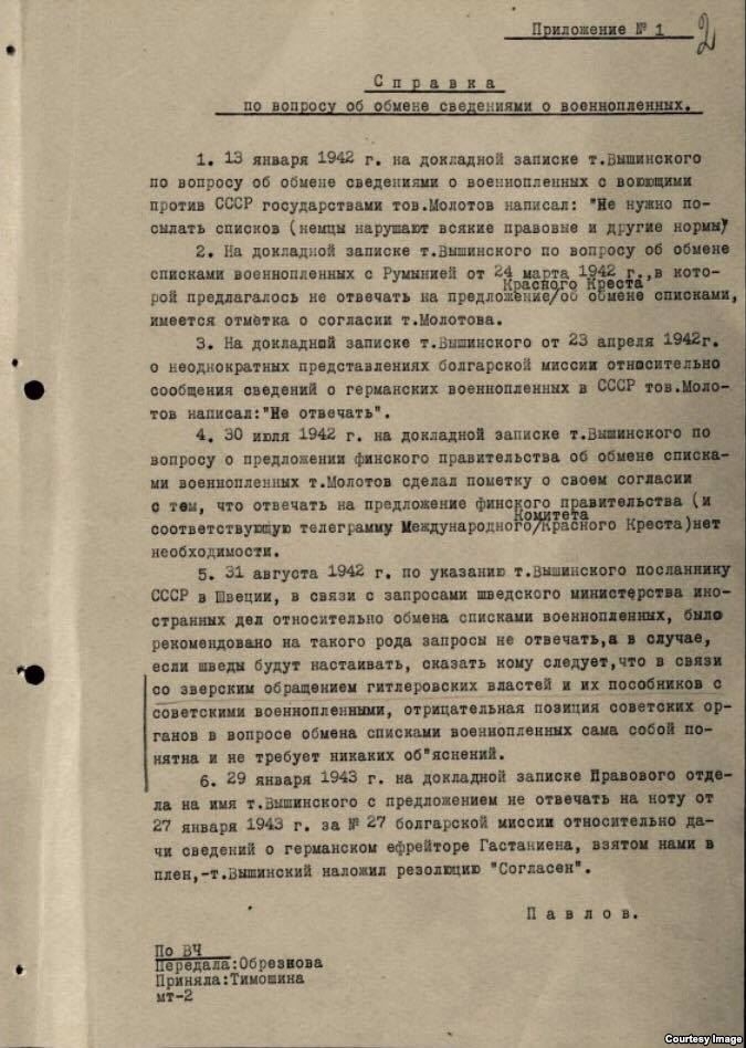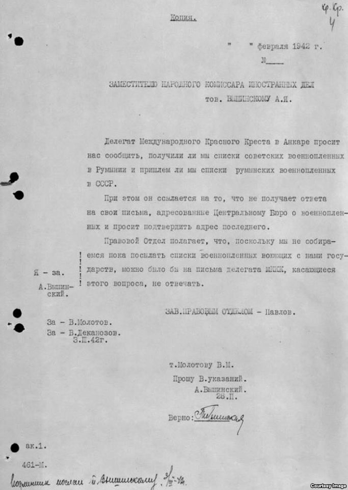— Предложения, которые делали Молотову румыны. Как ни странно, Румыния оказалась самой упорной в попытках каким-то образом помочь своим военнопленным в СССР или узнать их судьбу. В апреле 1942 года они прислали письмо, в котором сообщили, что отобрали 632 человека из числа советских военнопленных, неспособных к дальнейшей активной военной службе, и предложили их поменять на румынских военнопленных. На письме стоит виза Молотова: «Не отвечать». Но самое потрясающее письмо пришло позднее: румыны предложили отдать 1018 советских военнопленных в обмен на информацию о румынских военнопленных в СССР. То есть поменять живых людей на бумажные списки. Советское руководство это предложение также проигнорировало.
