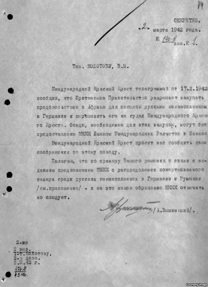 — Проблема положения советских военнопленных волновала не только Красный Крест. Добиться пересмотра позиции пытались и США, и Англия, и Турция, и Швеция. Даже Ватикан вызвался быть посредником в вопросе обмена сведениями между Германией и СССР. Об этом Молотову сообщил посол Стэндли. Однако Молотов в ответном послании указал, что этот вопрос в данный момент не интересует советское руководство.