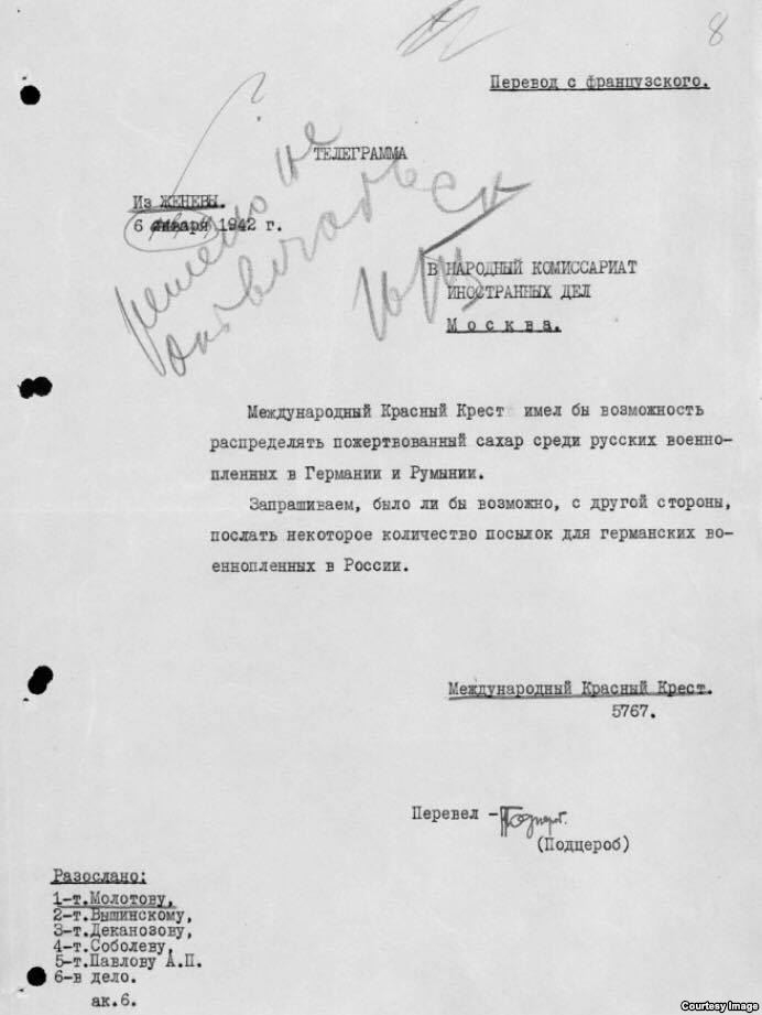 — Несколько лет назад Архив внешней политики РФ оцифровал и выложил в открытый доступ большое количество документов, касающихся работы народного комиссариата иностранных дел в годы войны. Для меня большой интерес представляли документы о взаимодействии советского руководства с Международным Комитетом Красного Креста. МККК — благотворительная международная организация со штаб-квартирой в Женеве, помогавшая во время войны военнопленным, раненым, беженцам. Уже 23 июня 1941 года Красный Крест прислал телеграмму Молотову, в которой говорилось, что они готовы предоставить всю свою помощь Советскому Союзу во время войны. В ответной телеграмме Молотов подтвердил заинтересованность. Красный Крест организовал в нейтральной Турции информационный пункт, куда должна была стекаться для обмена информация о пленниках всех сторон конфликта, и предложил государствам, ведущим войну, обменяться нотами о готовности соблюдать международные конвенции: Гаагскую и Женевскую. В июле-августе 1941 года такой обмен нотами произошёл между СССР и Германией — обе стороны сообщили, что будут соблюдать конвенции (СССР согласился соблюдать только Гаагскую), но только при соблюдении их противоположной стороной. Намерения остались только на бумаге: по отношению друг к другу ни Германией, ни СССР конвенции не соблюдались. Согласно конвенциям, военнопленных нельзя было использовать на тяжёлых работах, они должны были сносно питаться, имели право получать и отправлять письма, посылки, а захватившее их государство было обязано пересылать списки пленных в Красный Крест.