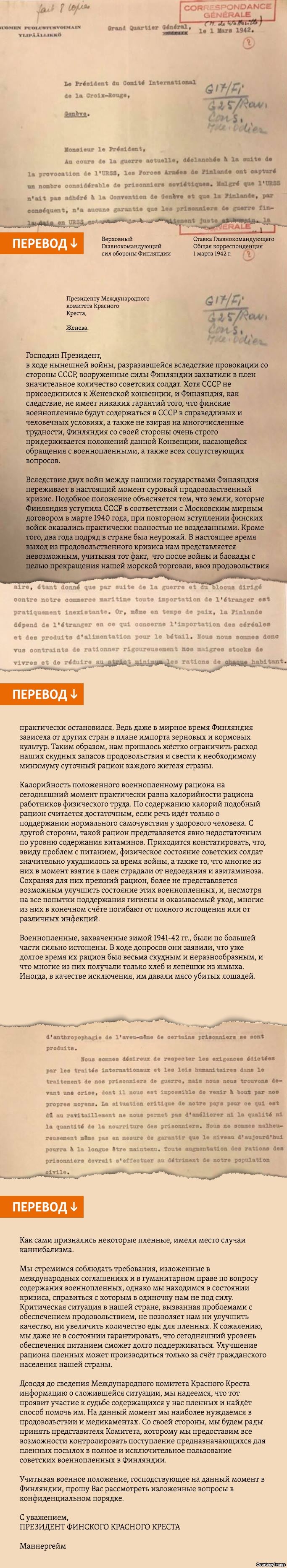 — Ещё два документа 1942 года на финском и французском языках — маршал Маннергейм сообщает Красному Кресту о численности советских военнопленных в Финляндии, их отчаянном положении и необходимом им питании. Что вам известно об этой истории?