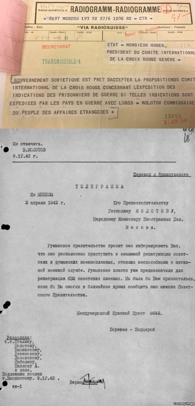 По документам из упомянутого архива видно, что отношение советского руководства к сотрудничеству с Красным Крестом с июня 1941 года по конец 1941 года сильно поменялось в худшую сторону. Этому способствовал целый ряд событий: бойцы Красной Армии массово попадали в плен, а информация, получаемая из лагерей, указывала на жестокость к пленным со стороны немцев. Однако стороны при помощи Красного Креста пытались найти какие-то точки сближения. В декабре 1941 года заместитель наркома Вышинский описал Молотову сложившуюся ситуацию: СССР получил от Германии, Венгрии, Румынии, Италии и Словакии сообщения, что те готовы пересылать списки советских военнопленных на условиях взаимности. Германия уже прислала список на 300 человек, а Румыния почти на 3000 человек. Вышинский писал, что ответный список немецких пленных подготовлен, и он считает целесообразным его отправить, иначе СССР может предстать в невыгодном свете. Однако Молотов поставил на записке визу: «...Не нужно посылать списков (немцы нарушают правовые и др. нормы)...» После этого события почти все входящие письма и телеграммы МККК в народный комиссариат иностранных дел визировались Молотовым: «Не отвечать».