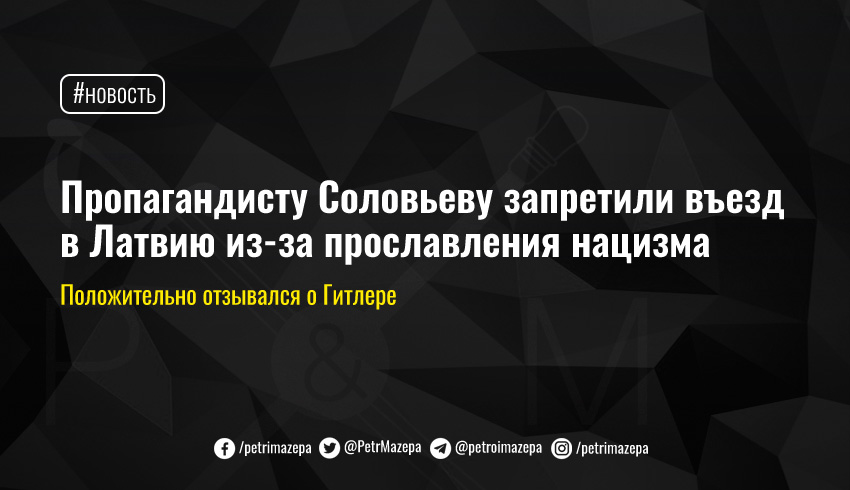 Латвия внесла в список нежелательных лиц российского телеведущего Владимира Соловьева. Это решение глава МИД страны Эдгар Ринкевич объяснил тем, что «прославление нацизма неприемлемо для Латвии».
