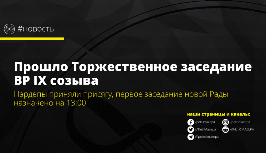 Глава Верховной Рады Украины VIII созыва Андрей Парубий открыл торжественное заседание по случаю принесения присяги народными депутатами Верховной Рады IX созыва. Избранные народные депутаты принесли присягу, после чего торжественное заседание было закрыто. Первое заседание нового созыва начнется в 13:00, и по словам нардепа от «Слуги народа» Руслана Стефанчука, не закончится пока не будет завершена вся повестка дня – около 27 вопросов.