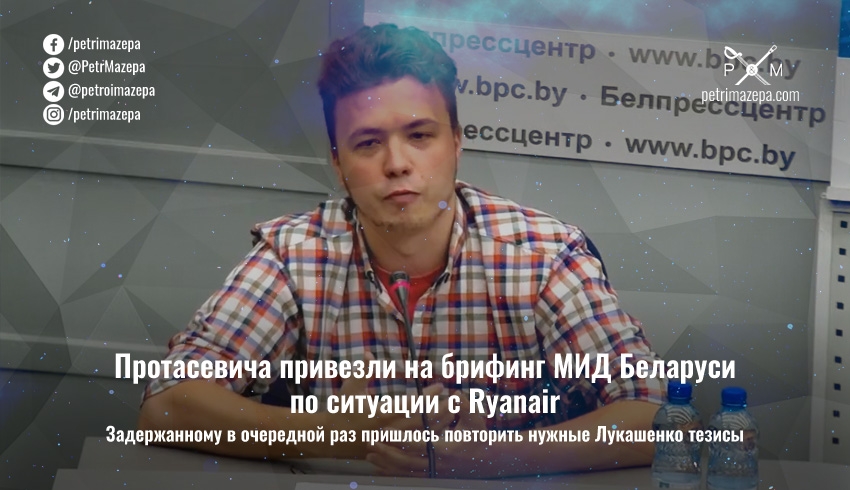 Ранее задержанный в Беларуси оппозиционный журналист Роман Протасевич появился на брифинге МИД страны сегодня, 14 июня. Его привели незадолго до начала брифинга, посвященному в том числе с ситуацией с незаконно посаженным в Минске рейсом Ryanair, на котором летел Протасевич.