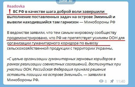 Стоило рашистам огрести на Змеином, как они резко вспомнили про жесты доброй воли и необходимость организации зерновых коридоров. Вот как сейчас объясняют отход с острова российские пропагандисты.