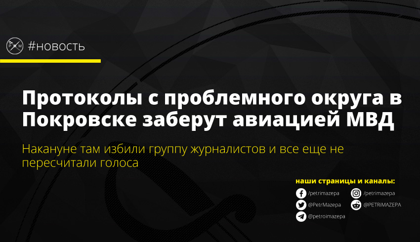 ЦИК установила бездействие ОИК №50 (в Покровске) и решила забрать «избирательную документацию из проблемного округа с помощью авиации МВД». Члены ОИК отказались выполнять решение суда и пересчитывать голоса. А когда журналисты начали снимать их встречу с руководством города (чей городской голова баллотируется по этому округу), то против работников СМИ применили физическую силу, а камеры разбили.