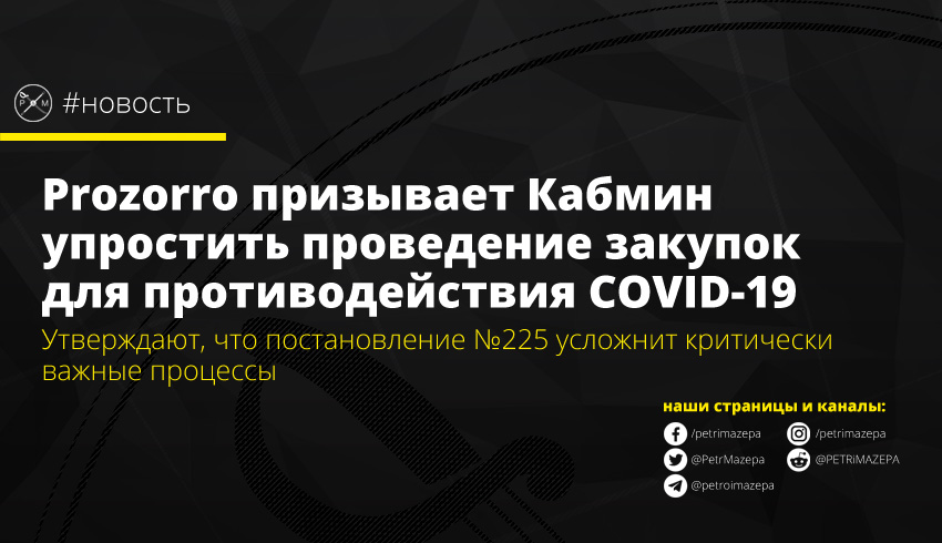 Prozorro и департамент сферы публичных закупок Минэкономики обратились к правительству с просьбой упростить и уменьшить время на проведение закупок для противодействия COVID-19. В Prozorro считают, что принятое правительством постановление №225 не облегчит, а наоборот усложнит и затянет критически важные закупки для преодоления коронавирусной инфекции.