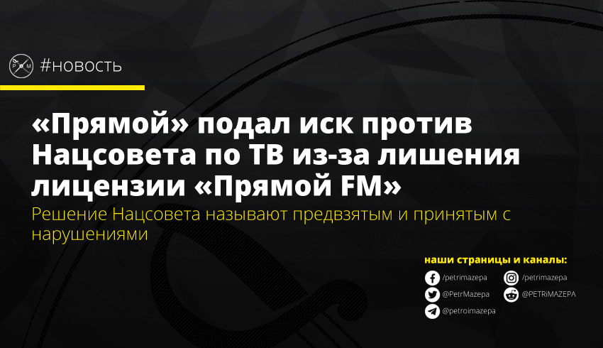 Телеканал «Прямой» подал иск против Национального совета по телевидению и радиовещанию в Окружной административный суд Киева. Телеканал выступает против решения Нацсовета по лишению лицензии радио «Прямой FM» - потому что решение с точки зрения истца необоснованное, предвзятое и принято с нарушением законодательно установленного порядка.