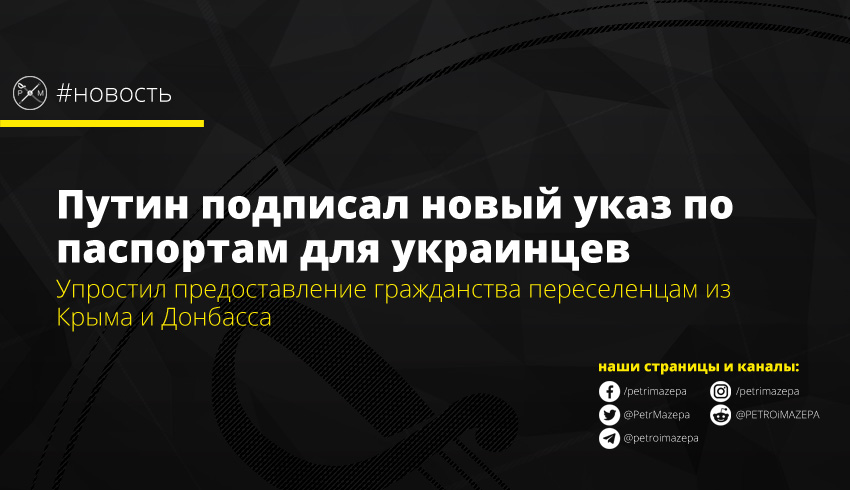- 24 апреля, в Кремле подписали указ об упрощенном порядке получения гражданства РФ для жителей ОРДЛО, которые в российской пропаганде проходят под видом псевдореспублик «ДНР» и «ЛНР».