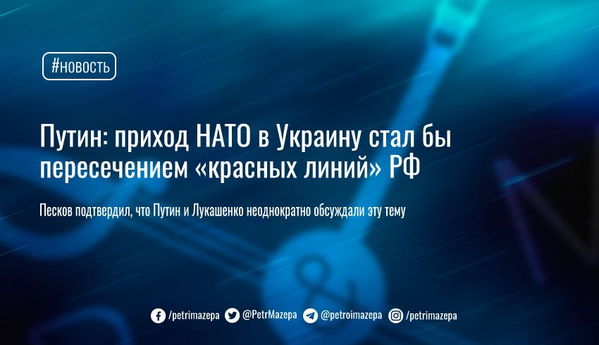 Путин говорил на переговорах с Лукашенко, что расширение инфраструктуры НАТО на территорию Украины означает для Москвы выход за рамки допустимого. «Тема потенциального расширения военной инфраструктуры НАТО на территорию Украины неоднократно упоминалась президентом Путиным… Президент Путин говорил, что это находится за гранью тех самых красных линий, о которых он неоднократно говорил ранее», - сказал Песков.