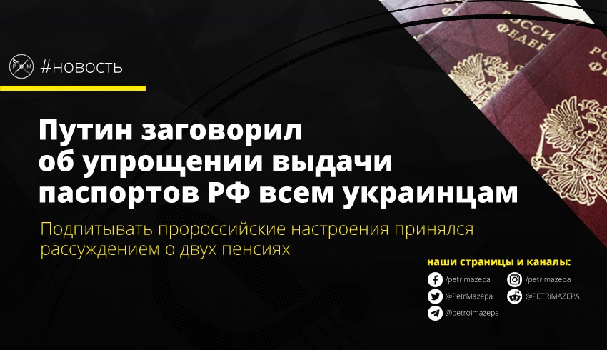 По итогам своего визита в Китай, главкарлик Кремля почему-то заговорил про упрощение выдачи российских паспортов всем жителям Украины. А чтобы эта сказка смотрелась привлекательнее, начал вещать о получении пенсий и от Украины, и от РФ.