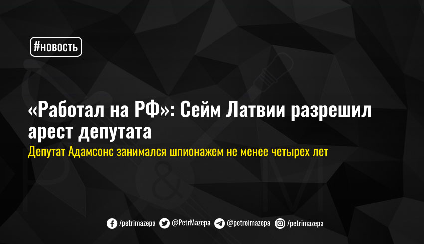 Сейм Латвии разрешил задержание и применение других мер безопасности против депутата партии «Согласие» Яниса Адамсонса – его подозревают в шпионаже в пользу РФ. Кроме того, Адамсонс долгое время работал в погранслужбе СССР, а сейчас его должность не мешает ему получать российскую пенсию.