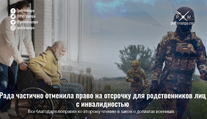 Верховная Рада вчера приняла законопроект №9342 о «внесении изменений в некоторые законодательные акты Украины относительно отдельных вопросов, связанных с прохождением военной службы во время действия военного положения». Он регулирует в частности доплаты и отпуска военным, но ко второму чтению благодаря поправке в законопроекте появилась и норма об ограничении права на отсрочку для лиц, имеющих родственников с инвалидностью 1 или 2 группы.