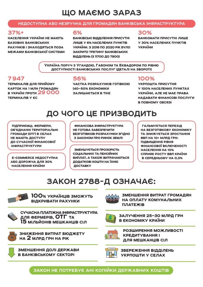 Министр инфраструктуры Владислав Криклий сообщил, что законопроект призван облегчить доступ к банковским услугам в первую очередь 15 миллионам сельских жителей. «Сегодня банкоматы есть только в 30% населенных пунктов, банковские отделения - вообще только в 6%. По уровню доступности финансовых услуг для людей мы где-то рядом с Угандой, Габоном и Эквадором», - так Криклий прокомментировал нынешнюю ситуацию с банковскими услугами в Украине.