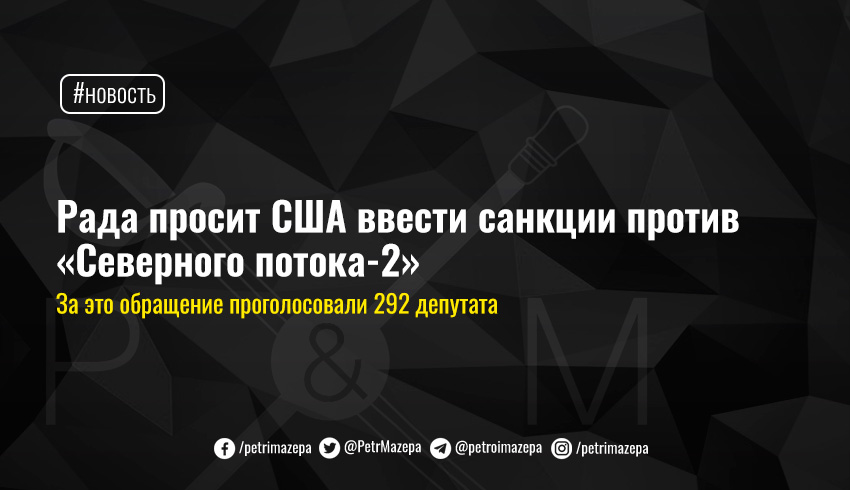Верховная Рада сегодня, 21 мая, приняла постановление №5520 об обращении в Палату представителей и Сенат Конгресса США с просьбой ввести санкции против строительства газопровода «Северный поток-2».