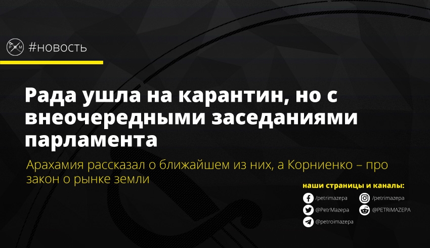 Председатель фракции «Слуга народа» Давид Арахамия прогнозирует, что внеочередное заседание Верховной Рады может состояться в начале следующей недели. А его заместитель Александр Корниенко уверяет, что рассмотрение законопроекта о рынке земли продолжится только после завершения карантина.