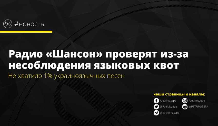 Национальный совет по вопросам телевидения и радиовещания назначил внеплановую выездную проверку ООО «Телерадиокомпания« Шансон». Причина - нарушения законодательства относительно размещения в эфире песен на украинском языке.