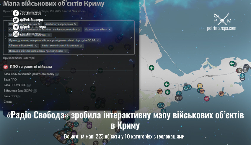 Журналисты «Крым.Реалии» (проект «Радио Свобода») опубликовали интерактивную карту оккупированного в 2014 году россией Крымского полуострова с 223 действующими, временными и законсервированными военными объектами России в 10 категориях с геолокациями. Цель — предупредить гражданских об опасности нахождения возле этих объектов.