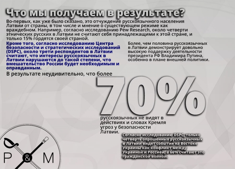 Что мы получаем в результате? Во-первых, как уже было сказано, это отчуждение русскоязычного населения Латвии от страны, в том числе и мнение o существующем режиме как враждебном. Например, согласно исследованию Pew Research, около четверти этнических русских в Латвии не считают себя принадлежащими к этой стране, и только 15% гордятся своей страной. Кроме того, согласно исследованию Центра безопасности и стратегических исследований (DSPC), около трети респондентов в Латвии считают, что интересы русскоязычных в Латвии нарушаются до такой степени, что вмешательство России будет необходимым и оправданным. Кроме того, более половины русскоязычных в Латвии демонстрирует довольно высокую поддержку деятельности президента РФ Владимира Путина, особенно во внешней политике.