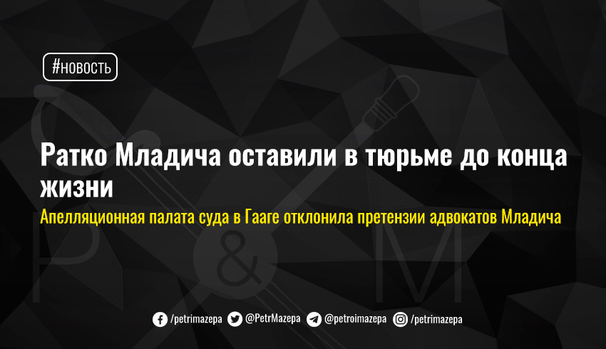«Апелляционная палата... подтверждает приговор Младича к пожизненному заключению, вынесенный судебной палатой», - говорится в решении судебного органа, завершающего дела Международного трибунала по бывшей Югославии.