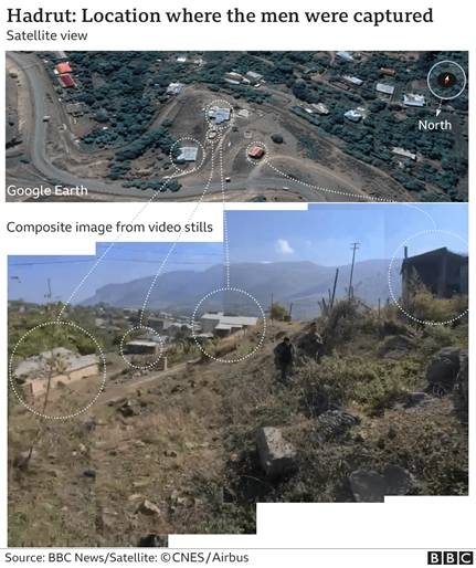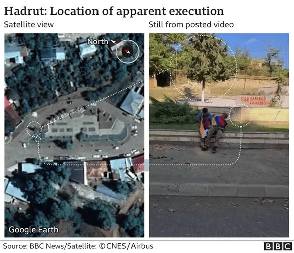 Авторы публикации «Кто убил Беника и Юрия? Би-би-си разбирают видео с расстрелом пленников в Карабахе», как вы помните — Григор Атанесян и Бенджамин Стрик. Они по объектам на видео определили координаты мест съёмки. Это 39.524118, 47.027827.