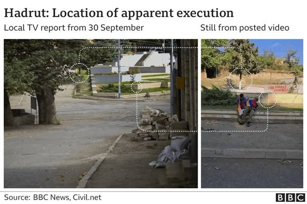 По мнению эксперта Уотерса, опираясь на заявления азербайджанской стороны, Гадрут был под контролем ВС Азербайджана в период 9-15 октября. А съёмки велись 14 октября. Анализ теней от сайта SunCalc показывает время казни в 14:00. Плюс за отсутствием точных координат возможна погрешность вплоть до часа. Ник Уотерс пришёл к выводу, что это было 14 октября в 15:11.