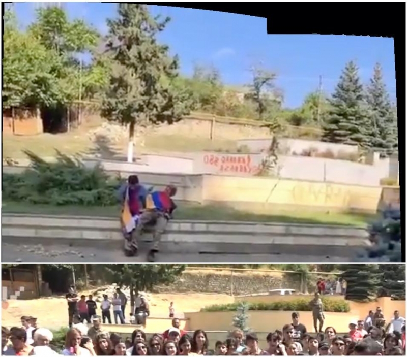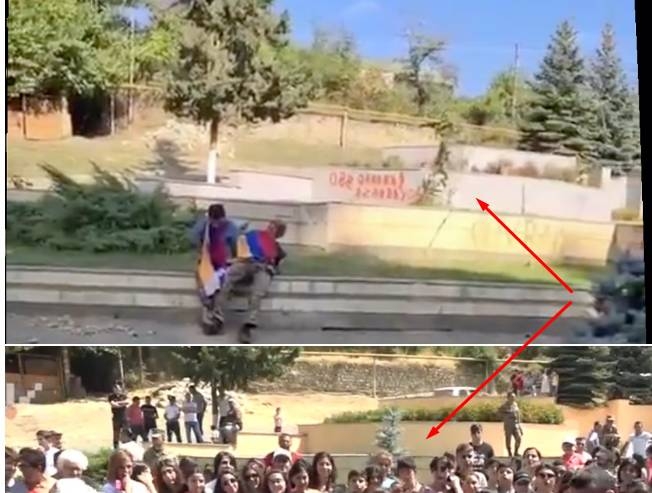 Первое, что бросается в глаза — на фоне отсутствия знаков различия на рукаве одного из бойцов вдруг мелькает армянский флаг. И так же быстро исчезает из кадра. Можно предположить, что это диверсионная группа азербайджанцев. Но они не стали бы устраивать цирк с флагами и съёмкой в городе на линии соприкосновения. С беспрерывной угрозой попасть под огонь дрона не гуляют спокойно в форме противника.