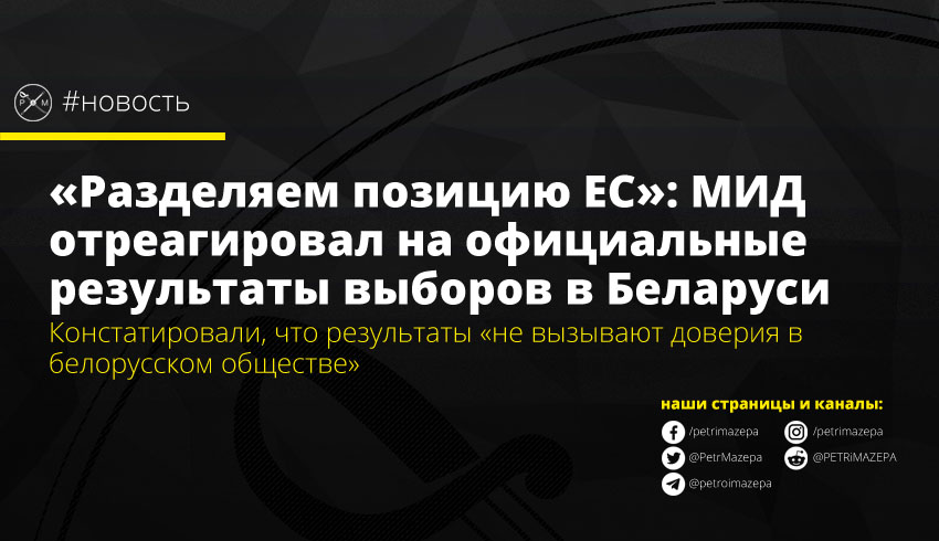 Министерство иностранных дел Украины опубликовало заявление касательно выборов в Беларуси – констатировали, что официально обнародованные результаты выборов президента не вызывают доверия в обществе, что Украина в целом разделяет позицию Евросоюза, и призвали власти Беларуси не допустить дальнейших преследований по политическим мотивам.