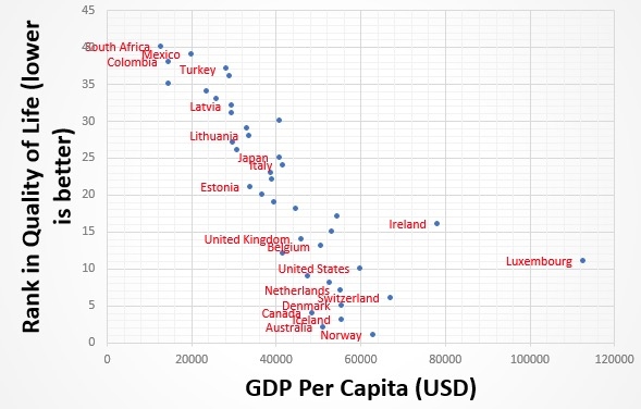 Как мы видим, высокий ВВП на душу населения не всегда означает победу. Например, у Люксембурга всё в порядке со статистикой — но есть страны вроде Канады и Норвегии, готовые предоставить куда более высокое качество проживания. Если бы ВВП толково измерял благосостояние, в странах с более высоким показателем жилось бы лучше.