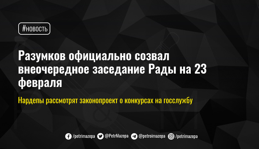 Председатель Верховной Рады Дмитрий Разумков подписал распоряжение о созыве внеочередного пленарного заседания Верховной Рады Украины по требованию президента Владимира Зеленского - 23 февраля на 12:00. На заседании планируют рассмотреть законопроект, ранее ветированный Зеленским, который касается госслужбы.