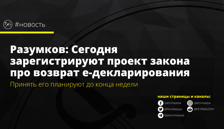 На согласительном совете Верховной Рады спикер ВР Дмитрий Разумков сообщил, что сегодня до конца дня будет зарегистрирован законопроект, который предусматривает возобновление действия закона об электронном декларировании, а также статьи Уголовного процессуального кодекса о наказании за незаконное обогащение.