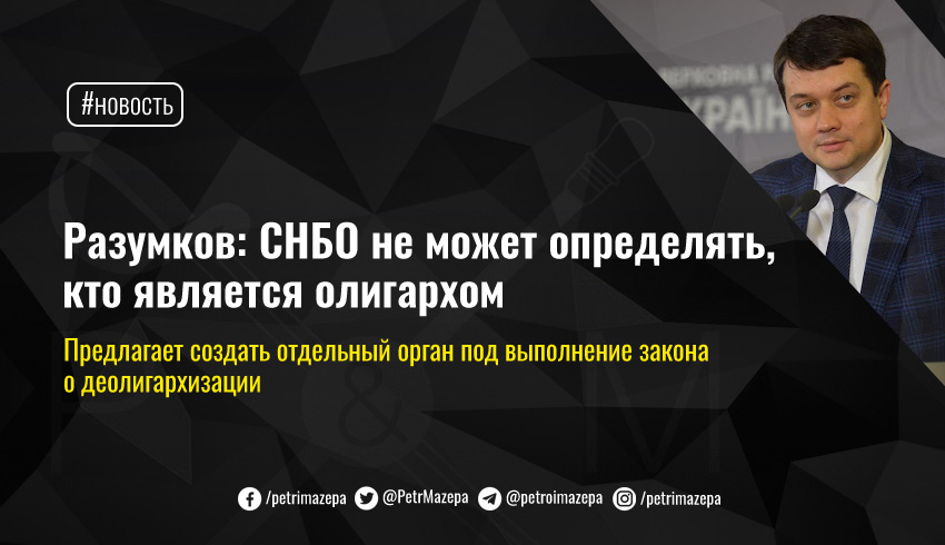 Председатель Верховной Рады Дмитрий Разумков на брифинге заявил, что в законопроекте президента Владимира Зеленского о деолигархизации есть конфликт интересов. Также он уточнил, что СНБО – «это консультативный, совещательный орган» и потому, лучше бы создать под выполнение закона отдельную комиссию, которая будет пользоваться доверием как у народа, так и у политиков и международных партнеров.
