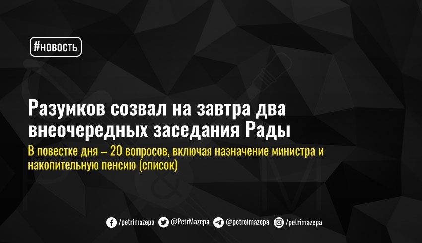 Глава Верховной Рады Украины Дмитрий Разумков подписал распоряжения о созыве на завтра двух внеочередных заседаний парламента. На первом планируется рассмотреть законопроект о снижении цены на электроэнергию для проживающих около АЭС, а на втором – еще 19 документов.