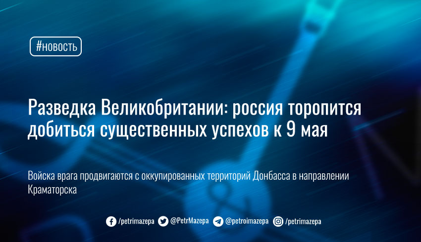 Министерство обороны Великобритании представило последние данные разведки по ситуации в Украине — россия хочет добиться существенного успеха к 9 мая, войска врага продвигаются с оккупированных территорий в направлении Краматорска, и намерены усилить активность в воздухе.