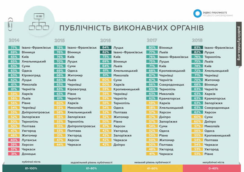 Согласно данным исследования, за последние пять лет все муниципалитеты в областных центрах стали более публичными, а среднее значение Индекса публичности для всех городов возросло с 51% до 68% процентов. Муниципалитет Ивано-Франковска с показателем индекса 86,8% стал лидером в сфере политики публичности в 2018 году. Это первый город, который за шесть лет измерения вошел в категорию полностью публичных городов. То же касается уровня публичности всех субъектов властных полномочий Ивано-Франковска - головы, исполнительных органов и депутатов. Но вместе с этим остаются недостатки, связанные с отчетностью депутатов и обнародованием текстов отчетов.