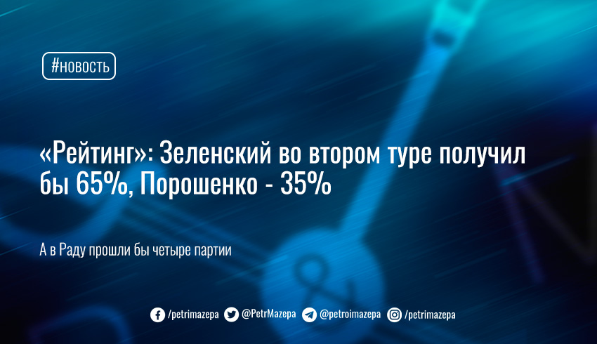 «Рейтинг»: Зеленский во втором туре получил бы 65%, Порошенко - 35%