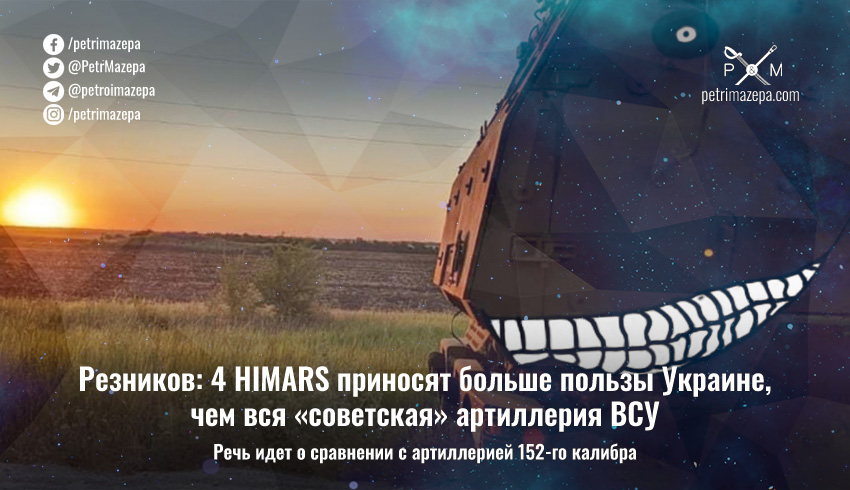 В интервью Forbes министр обороны Алексей Резников заявил, что даже первые четыре установки HIMARS, которые получила Украина от США, приносят в вопросе уничтожения вражеской техники, боекомплекта и ГСМ больше пользы, чем вся артиллерия советского периода, которая еще находится на вооружении ВСУ.