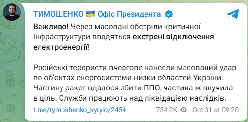 Согласно данным из аккаунтов местных властей, из-за обстрелов в Харькове остановлено метро, часть Киева без воды, а во многих городах исчезла электроэнергия. Заместитель главы Офиса президента Украины Кирилл Тимошенко сообщил, что из-за массированного обстрела критической инфраструктуры вводятся экстренные отключения электроэнергии. Об изменениях в графиках отключений сообщают ОВА по всей Украине – от Харькова до Одессы.