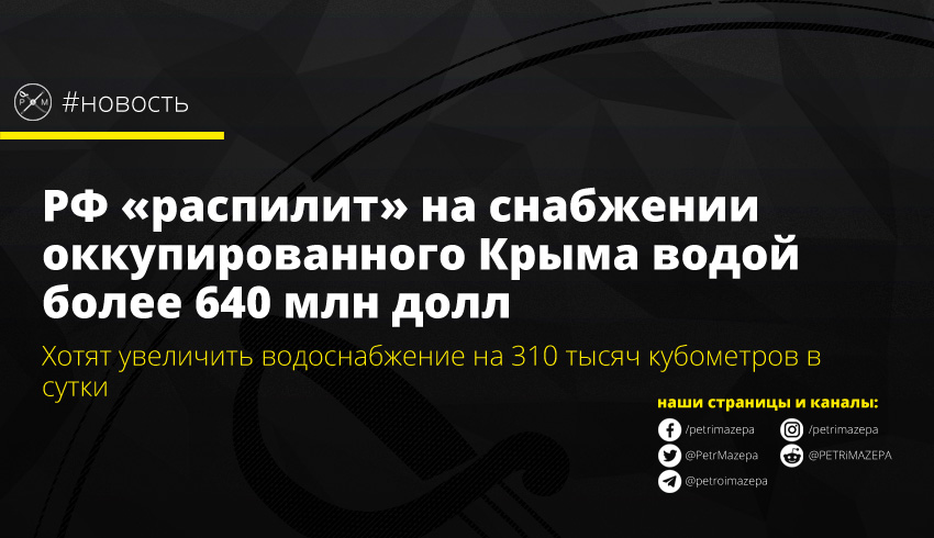 Правительство страны-агрессора подготовило план по созданию «современной системы водоснабжения» в оккупированном Крыму. Потратить на это планируют 50 млрд рублей (более 640 млн долл). Согласно заявлениям представителей оккупационных властей, это должно помочь увеличить ежесуточное водоснабжение на 310 тысяч кубометров.