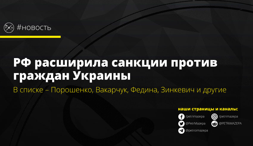 Страна-агрессор расширила санкции против граждан Украины – в список добавилм 43 фамилии, среди которых в том числе пятый президент Украины Петр Порошенко, нардепы от «ЕС» Михаил Забродский и Яна Зинкевич, нардепы от голоса Ярослав Железняк и Кира Рудик, Святослав Вакарчук и даже нардепы из «Оппоблока».